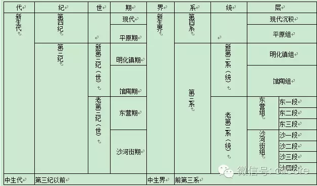 地質工作者常常根據不同地區地層沉積的特點進行區域性的分層,自統以下又細分為“組”、“段”。見下表: