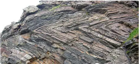 巖層在側方壓應力作用下發生的彎曲叫褶曲。褶曲僅指巖層的單個彎曲,而巖層的連續彎曲則稱為褶皺。褶曲的基本類型有兩種:背斜和向斜。背斜是核部的巖層相對較老,兩翼的則較新的褶曲。向斜是核部的巖層相對較新,兩翼的則較老的褶曲。